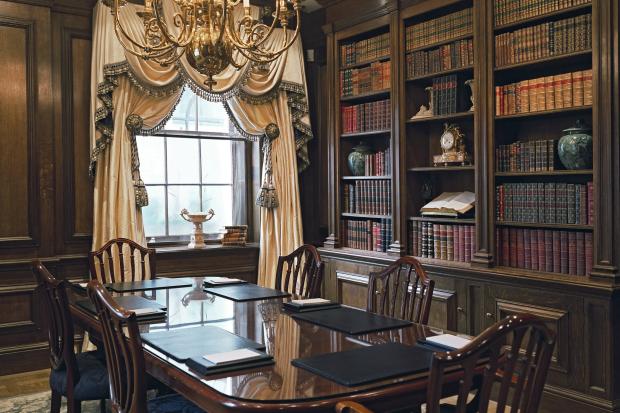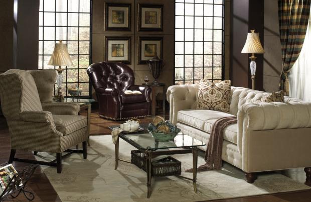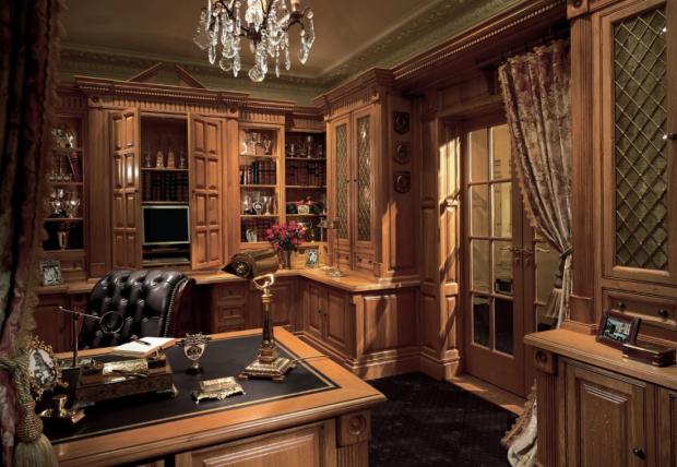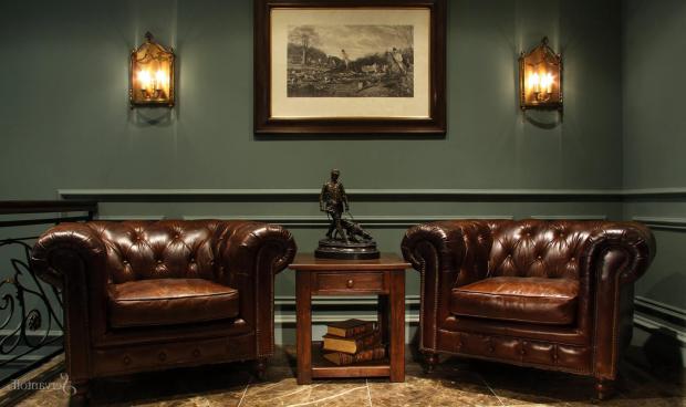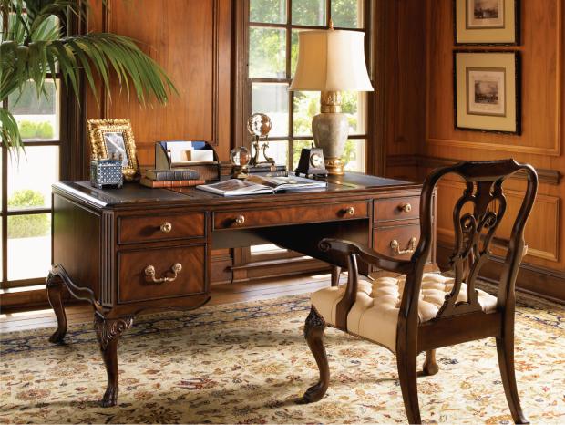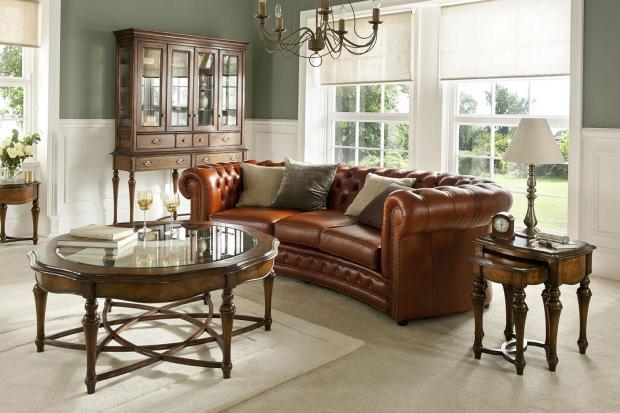 - Мебель преобладает классическая. Также она может включать в себя элементы других европейских стилей – резной декор, готические мотивы, витые ножки, бронзовые или латунные вставки. Обивка из ткани, чаще всего с мелким рисунком, или из кожи.