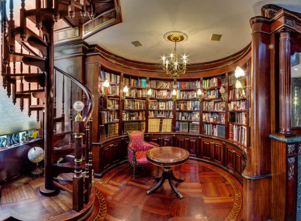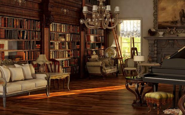 Если позволяет площадь, дополните интерьер гостиной в английском стиле зоной библиотеки – высокие книжные полки из дерева, уютный и мягкий диван, а также журнальный столик.