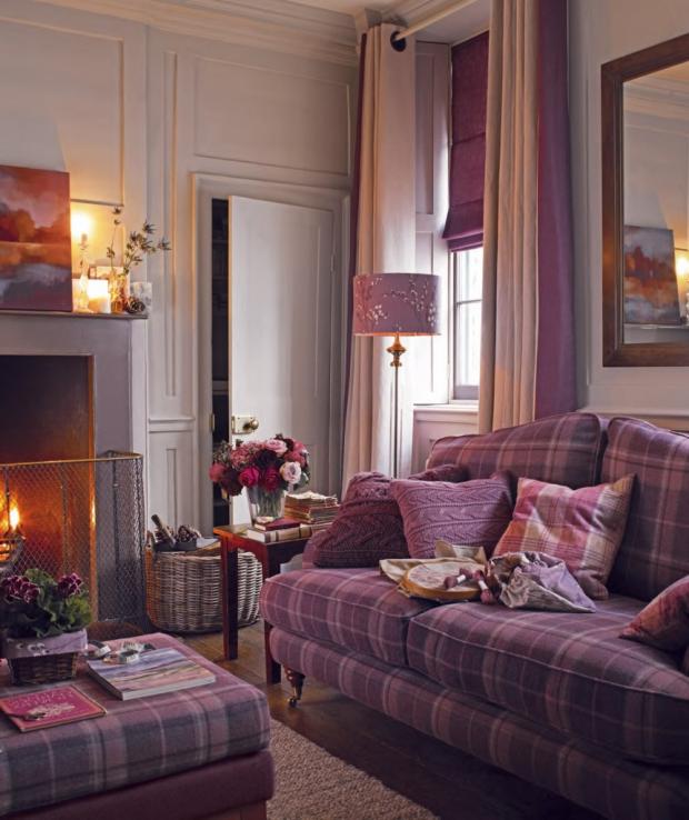 Возле камина обустройте диванную зону. - Мягкую мебель можно выбрать кремового цвета с растительным узором песочного тона.