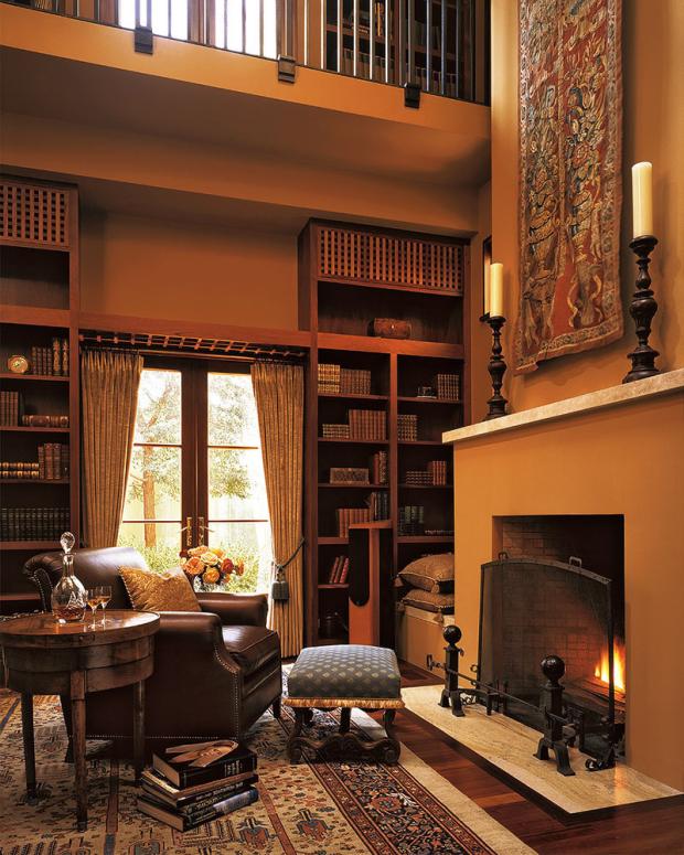 Дополните пол натуральным ковром бежевого цвета с мелким растительным узором. - Сделайте камин, обложив его натуральным камнем близким по цвету к обоям.