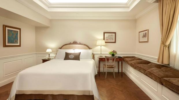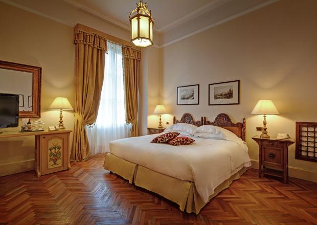 на нем кремовый ковер аналогичной расцветки и дизайна, как обои. - Двуспальная кровать с деревянным, резным основанием.