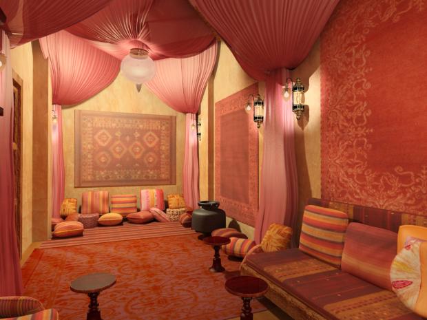 - Дополнить стены можно коврами нежно-красного цвета с красивым орнаментом.