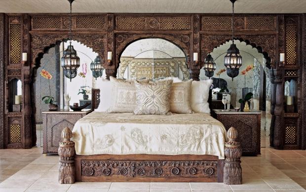 - Центром внимания сделайте двуспальную кровать с высоким изголовьем и деревянной резьбой. Изножье и изголовье могут дополнять изображения индийской культуры (женщины в сари, несущие амфоры, медитирующие йоги, божества).