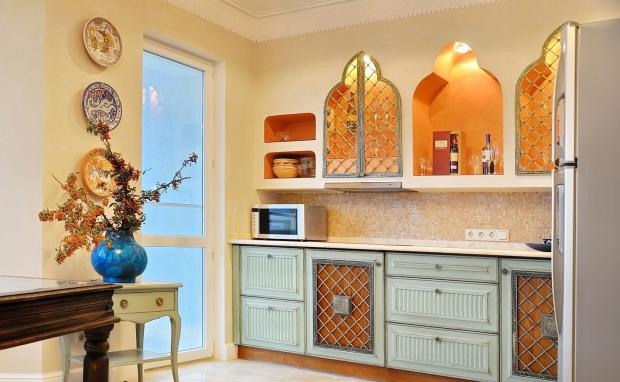 - Для отделки стен кухни используйте натуральный камень, можно бирюзового цвета со светло-золотистыми узорами.
