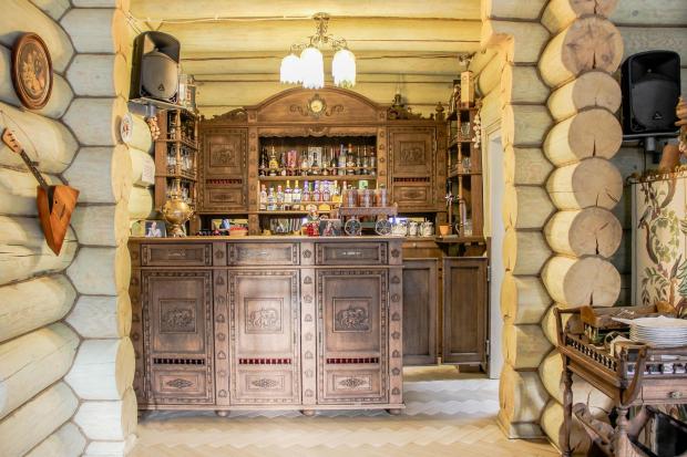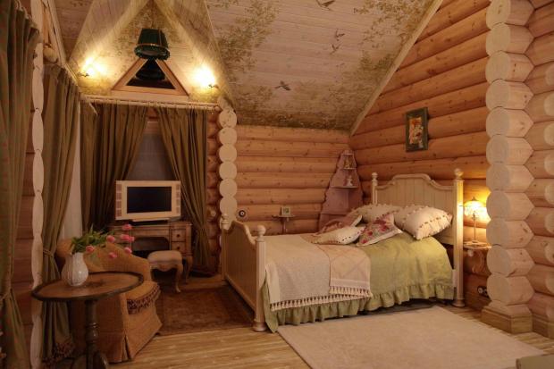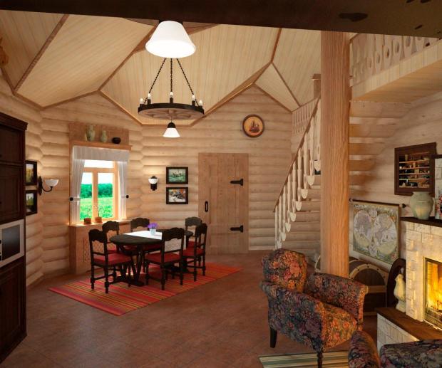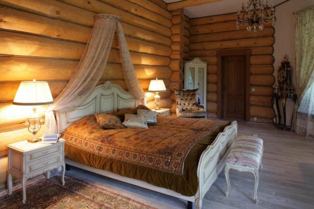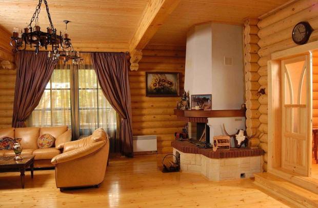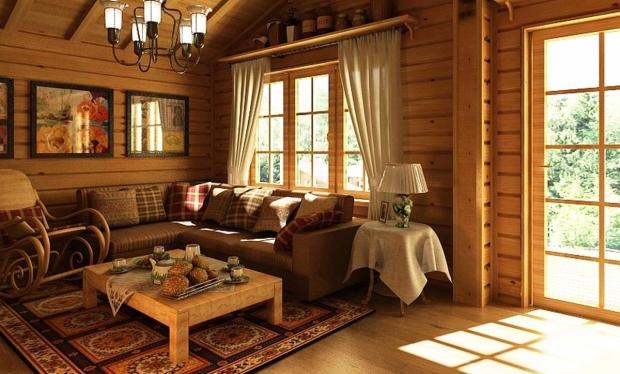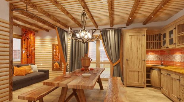 - Используется много натурального дерева. Оно служит не только материалом для отделки поверхностей, но и сырьем для мебели. Использовать лучше всего сорта древесины, распространенной в России (сосна, дуб, ясен, кедр, береза).