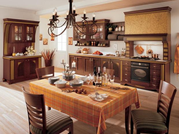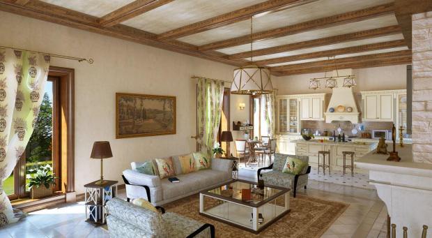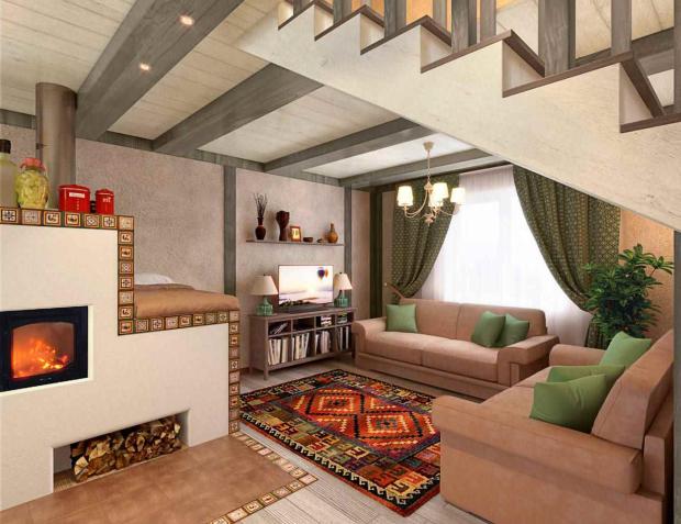 В гостиной сделайте камин, а еще лучше печь. Оба варианта не только согреют зимой, но и внесут в обстановку желаемый колорит. Современную технику замаскируйте за дверками шкафов.