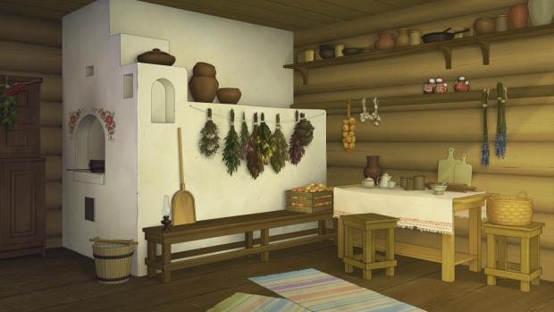 Используйте массивную деревянную мебель с резьбой: лавки, столы, кровати, шкафы, стулья. Дополните обстановку сундуками, ступами, деревянными бочками, шкатулкам.