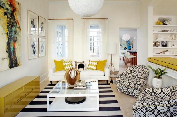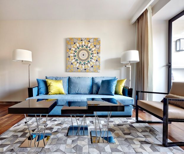 Геометрические узоры красиво смотрятся в текстиле помещения, обивке мебели и отделке стен. Самое главное – не переборщить. Одного – двух предметов мебели будет достаточно, чтобы создать стильный интерьер.