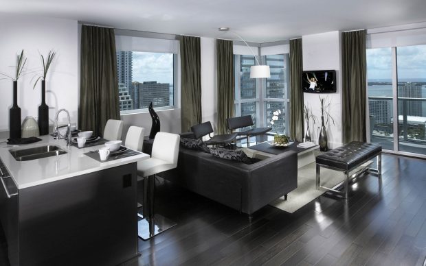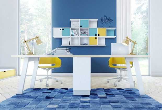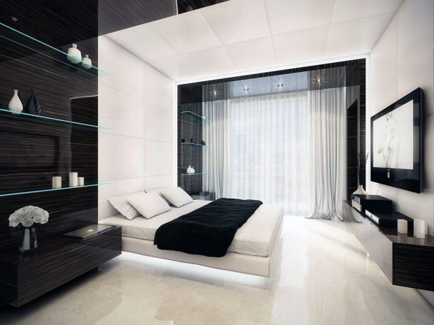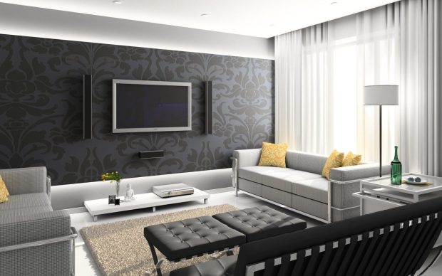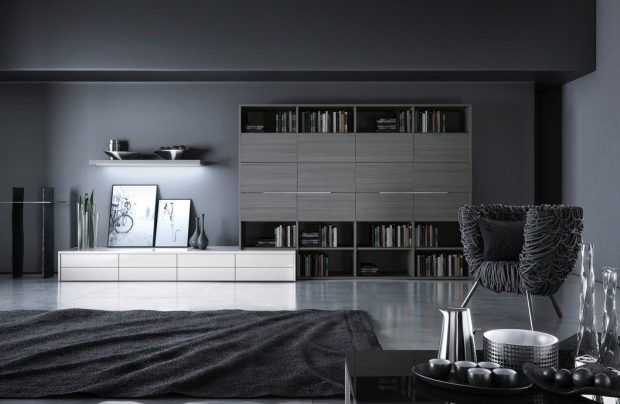 Стоит подбирать цветовое решение по принципу противоположных оттенков цветового круга, но сосредоточьте ваше внимание на одном-двух предметах мебели синего или зеленого цвета, а оставшуюся отделку лучше выполнить в градации черно-белой гаммы.