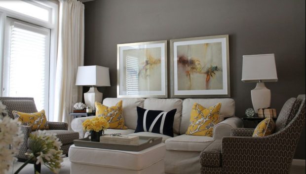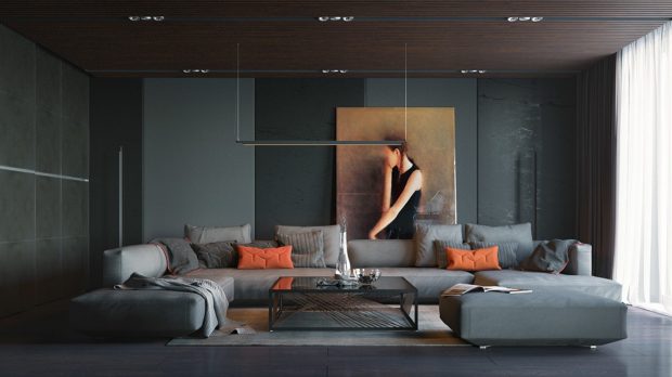 Серый цвет в интерьере и его сочетания прекрасно гармонируют практически со всей палитрой оттенков, здесь очень сложно ошибиться. Но не забывайте о том, что серый – холодный цвет, и старайтесь добавлять в интерьер теплые тона и текстуры мебели. Обратите внимание на сочетание серого и охры, бежевого, орехового. И добавьте в это сочетание яркий акцент – оранжевого, красного, винного, салатовый, небесно-голубого, или цвета мяты. Этим приемом вы создадите интересную и свежую атмосферу.
