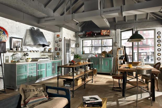 Хороший вариант оформления кухни в стиле киберпанк: блестящая металлом современная техника; нарочито грубая и разнородная мебель и посуда; пол, потолок и стены без отделки.