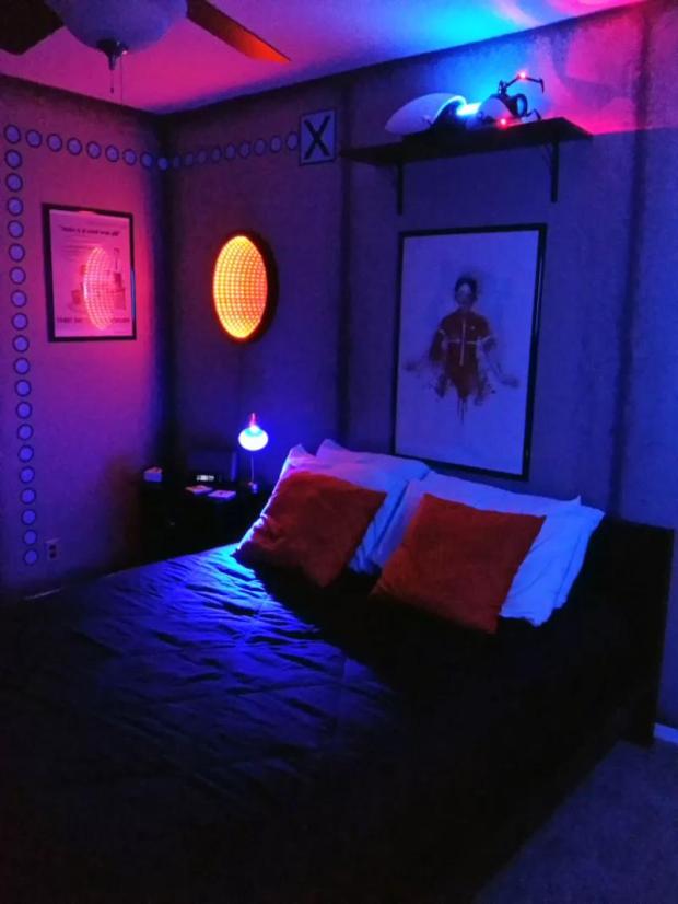 Совместить "жесткий" стиль киберпанк и спальню — место, в котором хочется полностью расслабиться, сложно, но можно.