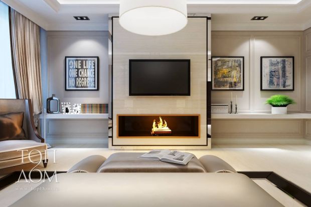 - Напротив – зона телевизора, боковую стену можно занять шкафом-купе или книжным стеллажом.