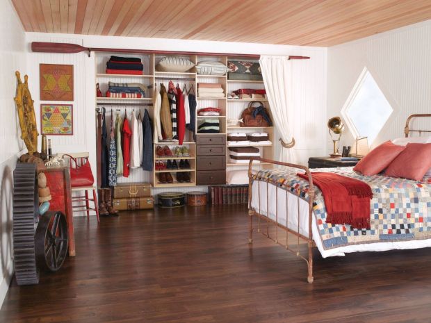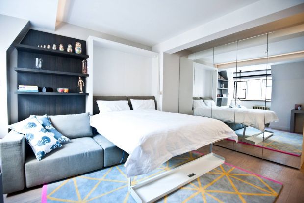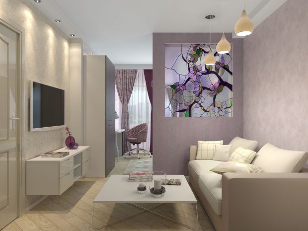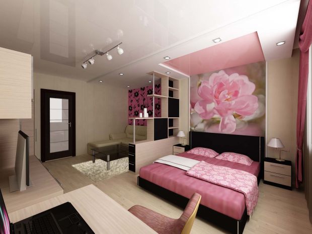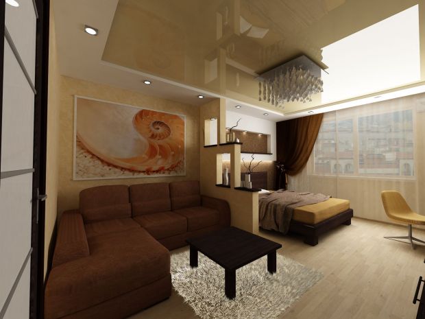 - Организованную рядом с входом систему хранения (платяной шкаф) можно отделить от спального места декоративной перегородкой, это упорядочит небольшое пространство.