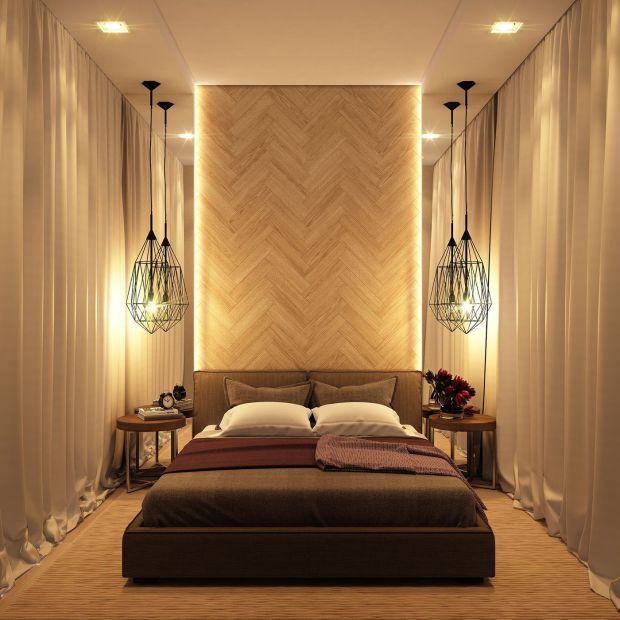 Грамотная планировка узкой спальни включает линейное расположение функциональных зон: