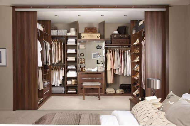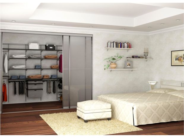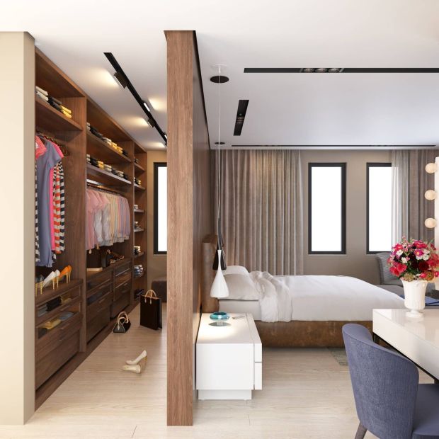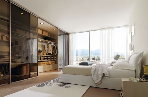 В элитном дизайне такое соседство не редкость. Большая гардеробная рядом – это удобно и рационально. Главная задача в таком интерьере – аккуратно оформить границу зон. Платяные шкафы встраивают в гипсокартонные ниши, отделяют глухой перегородкой, раздвижными дверями или мобильной шторой.