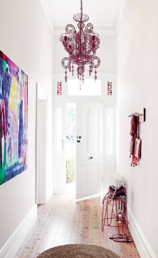 - Длинную и узкую комнату равномерно осветят вытянутые плафоны. Это оптимальное решение в вопросе, какую люстру выбрать в прихожую. В этом помещении можно скомбинировать центральный свет с дополнительным освещением, задействовав настенные светильники и небольшие торшеры.