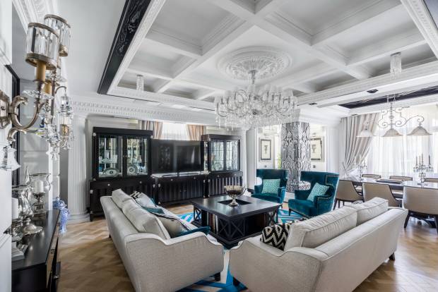 - Классику, арт-деко, барокко, ампир могут дополнять роскошные хрустальные люстры, состоящие из нескольких уровней.