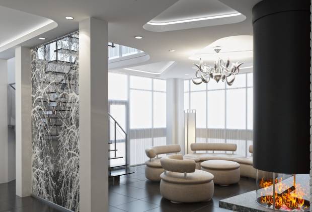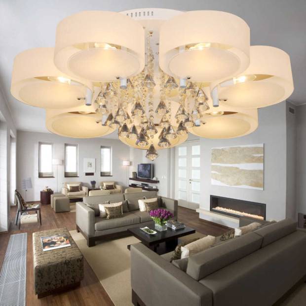 Нужно учитывать и эстетическую привлекательность, и возможность хорошо освещать комнату. Поэтому для таких помещений используют чаще всего многоуровневые люстры с большим диаметром, чтобы они заполнили пространство.