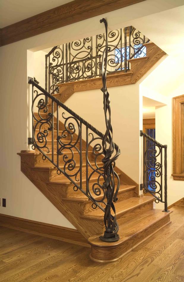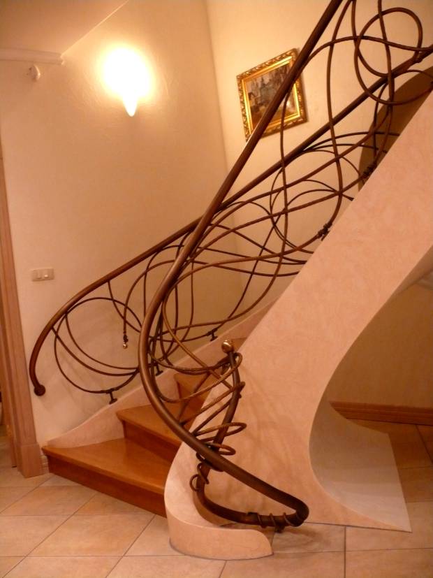 Витые лестницы с высокими перилами – вопрос не только эстетики, но и безопасности. Сами по себе резные или кованые лестницы и перила в интерьере выступают в роли эффектного акцента. "Воздух" в металлическом кружеве перил визуально расширит пространство, уменьшит габариты лестничной конструкции.
