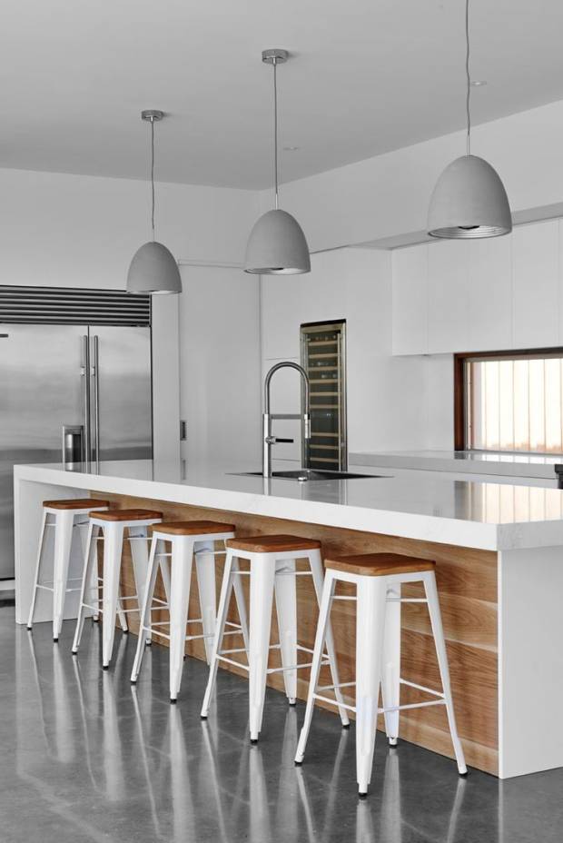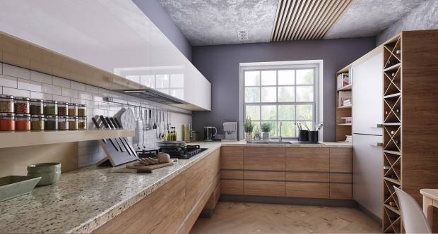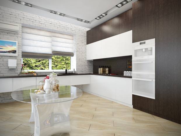 - Стиль контемпорари в интерьере кухни подчеркнет кухонный гарнитур серийного производства с глянцевым либо матовым покрытием.