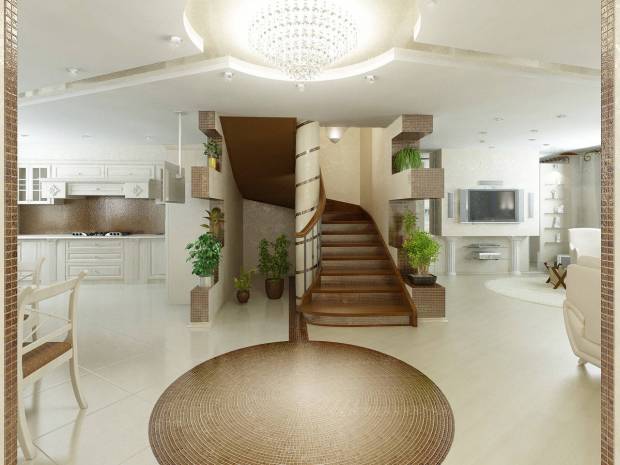 - Преобладание светлых оттенков, кофейных, коричневых, белого цвета. Допустимы яркие вкрапления в виде элементов мебели или декора.