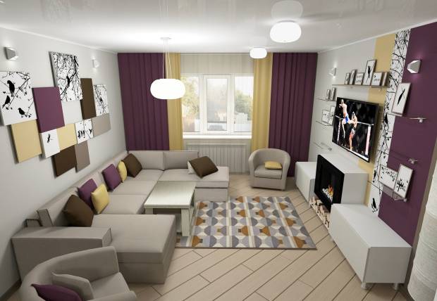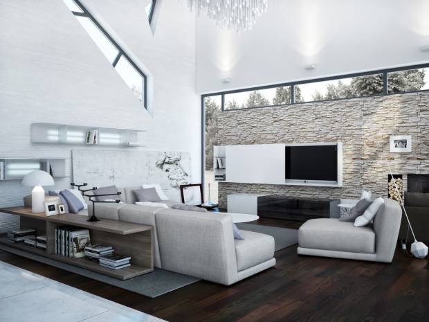 - Гостиную в стиле контемпорари дополнит вместительная стенка, можно вдоль всей стены.