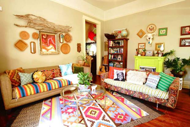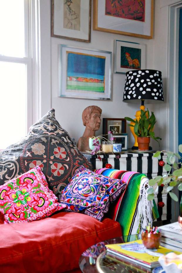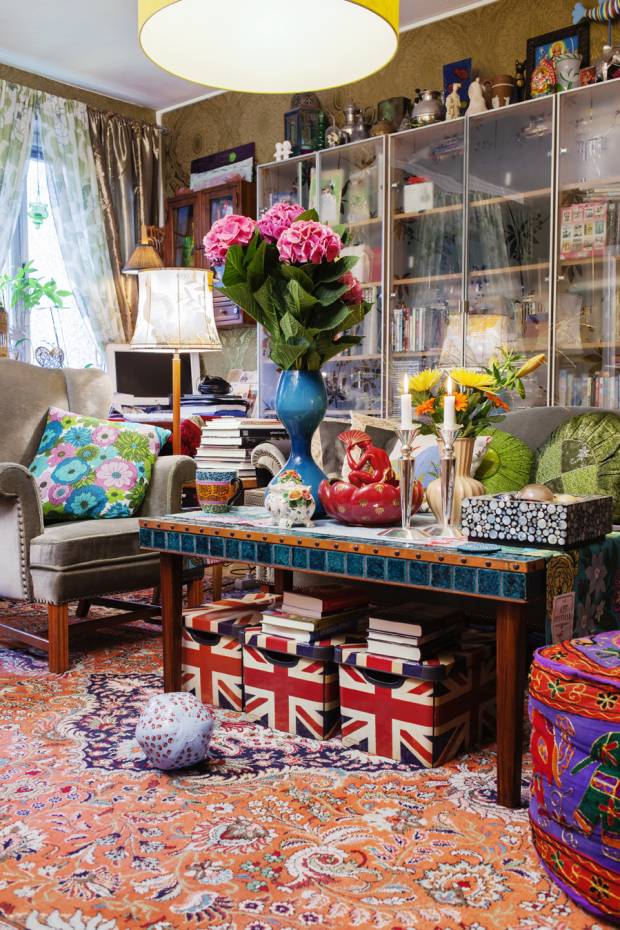 Вазы и горшки с цветами, картины и рамки с фотографиями, статуэтки и сувениры, живописно разложенные книги и различные вещицы, ковры или яркое напольное покрытие — обязательно, причем желательно использовать как можно больше из перечисленного одновременно!
