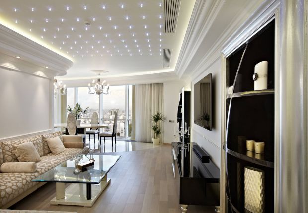 Реализованный в стиле арт-деко интерьер элитной квартиры привлекает внимание цветовыми контрастами и акцентированной декоративностью в форме мебели, светильников, рисунке ковра, скульптурами и живописью, комбинацией матовых и глянцевых фактур в обивке диванов. Обилие декора не нарушает главный принцип современных интерьеров, и пространство гостиной остается открытым за счет большой площади.