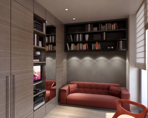 - Меблировка предполагает организацию множества мест хранения в виде стеллажей, открытых и закрытых полок, выдвижных секций, встроенных шкафов.