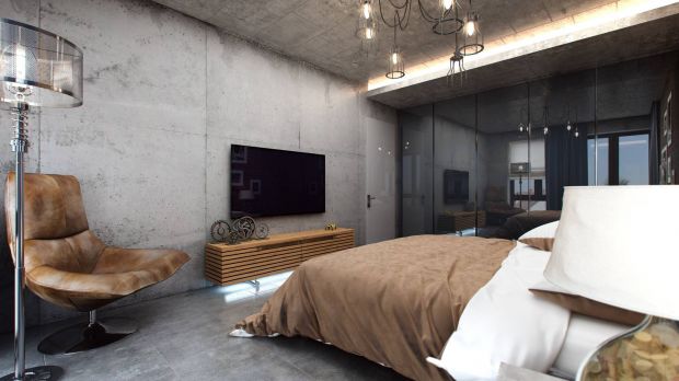 Промышленную эстетику можно удачно вписать в жилое пространство, стиль лофт из дизайна 2-комнатной квартиры – тому подтверждение. В отделке спальной комнаты преобладают грубые фактуры: бетонные стены, пол и потолок, цементные подставки под лампы, необработанная кирпичная кладка за кроватью.