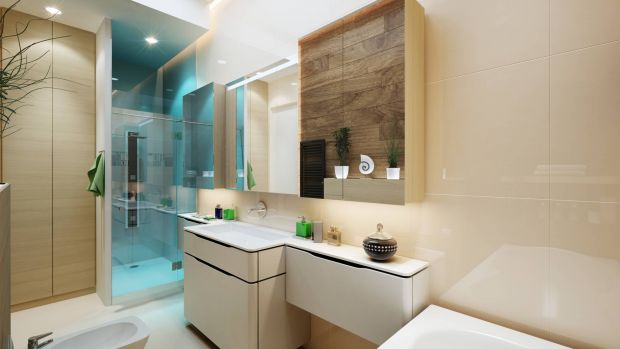 Актуальный дизайн любит порядок. Помещение санузла имеет функциональные зоны: область ванной/душевой, раковины, унитаза. Выделяется зона для хранения бытовой химии, полотенец, косметики. Отдельное место организуют для стиральной машины, сушилки, корзины для белья. Разные по назначению зоны принято отделять перегородками – прозрачными стеклянными или капитальными, зрительному разграничению помогут отделочные материалы.