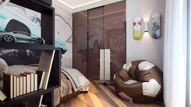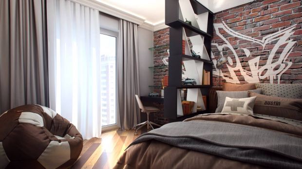 В дизайне 5-комнатной квартиры детская для мальчика-подростка выполнена в стилистике лофт. Акцентная стена отделана кирпичной кладкой с граффити, на соседнюю тоже нанесен яркий принт. Спальную и рабочую зоны разделяет перегородка-стеллаж. Бежево-коричневую гамму комнаты поддерживают кресло-груша и глянцевый шкаф-купе.