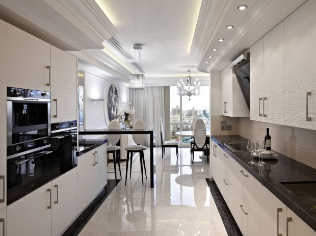 Пример того, как может выглядеть современная классика в интерьере кухни-гостиной, – проект 4-комнатной квартиры. Совмещенное пространство имеет нестандартную геометрию с множеством углов.