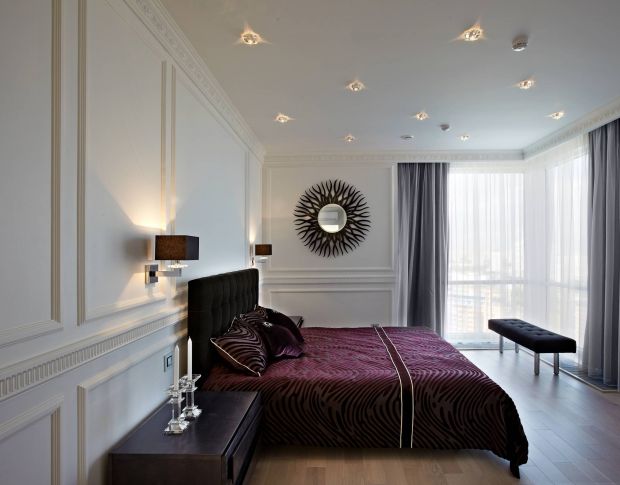 Во второй комнате вместо люстры решено использовать россыпь потолочных светильников. Данный вариант дизайна интерьера спальни в современной классике близок к аскетичному: в окружении белых стен со строгим лепным рельефом, шторами стального цвета и кроватью в коричнево-бордовых тонах.