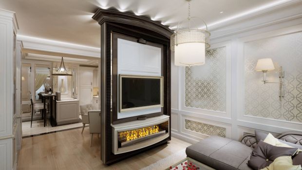 Интерьеры квартир в стиле современная классика гибко подстраиваются под имеющуюся планировку. В проекте трехкомнатных апартаментов в натуральных тонах стояла задача грамотно оформить совмещенную зону гостиной-столовой-кухни. В итоге выделены место отдыха с серым диваном, белая обеденная группа и такая же светлая кухня. Темно-коричневая перегородка с камином и вращающимся телевизором играет роль яркой контрастной детали. Элементы из мраморной плитки в сочетании с белой настенной лепниной смотрятся сдержанно и нарядно. Свой вклад в парадную обстановку вносят зеркала за барной стойкой.