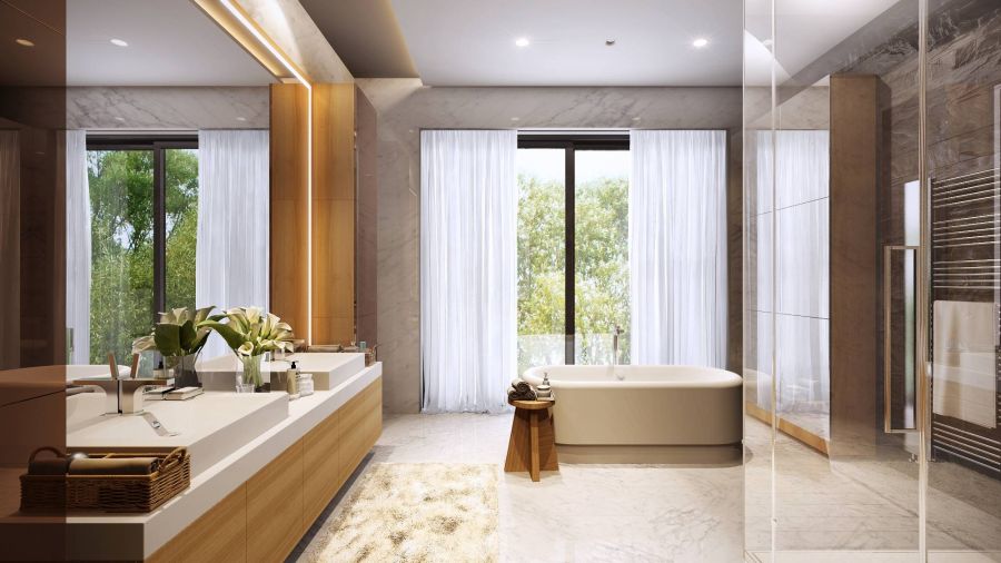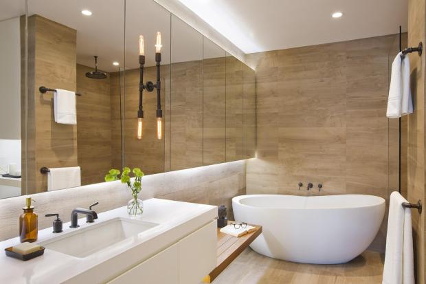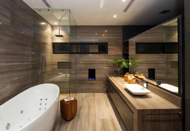 Красивые интерьеры ванн, оформленные в современном стиле и других направлениях, представлены в нашей галерее. К примеру, дизайн комнаты в частном доме на морском побережье. Помещение имеет панорамное остекление, внутри зеркальные панели комбинируются со светло-серой плиткой и деревом.