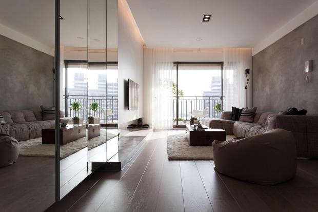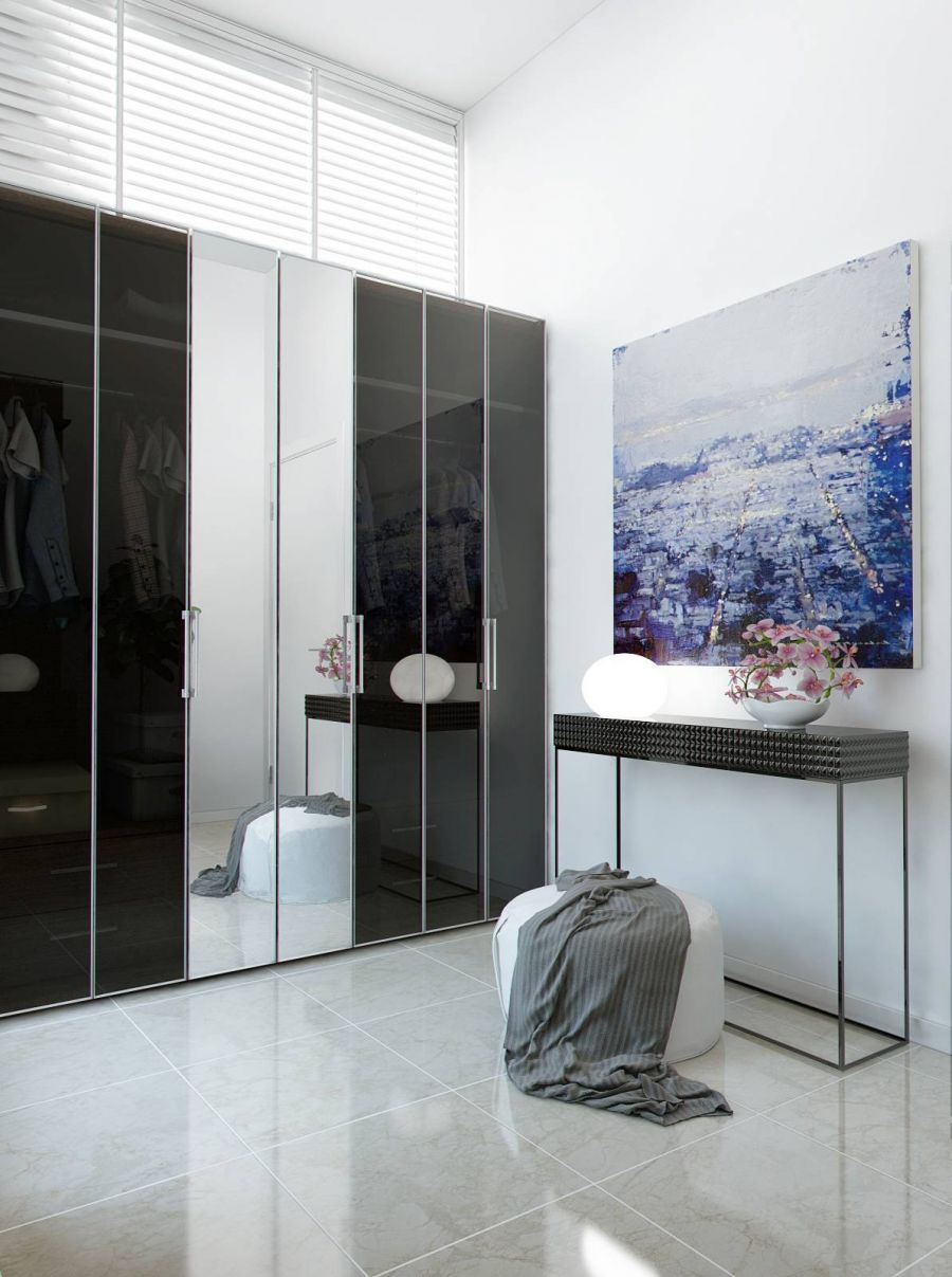 В проекте квартиры с тремя спальнями представлены интерьеры комнаты в современном стиле: у каждой – собственное оформление и настроение. Общий подход выразился в использовании зеркал и сияющих поверхностей.