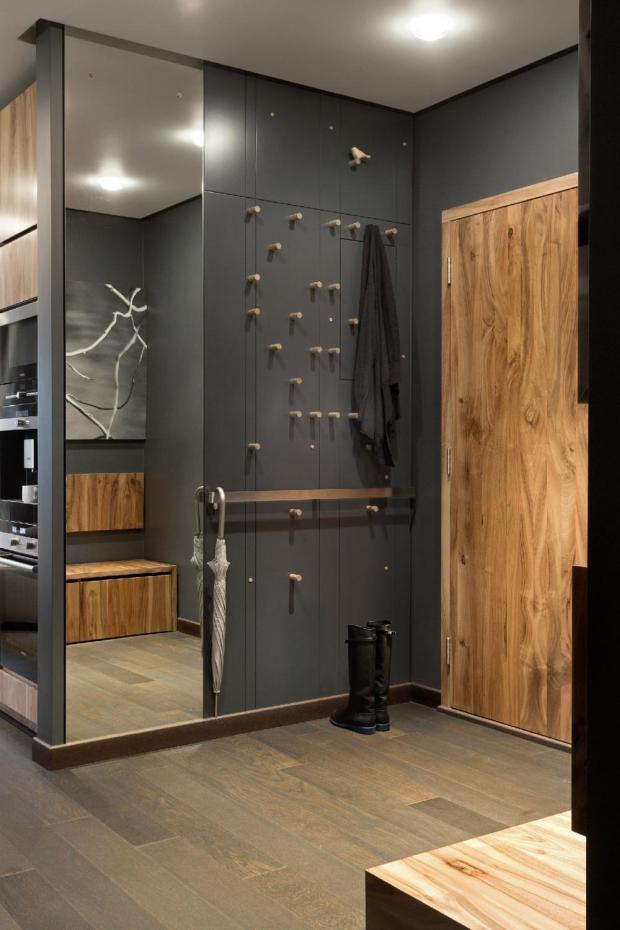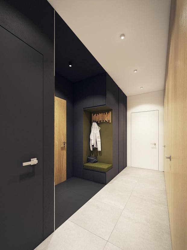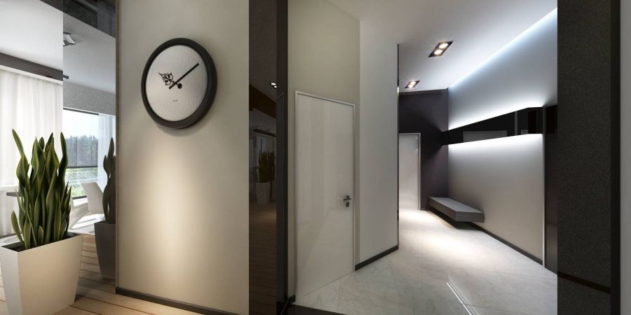 В дизайне таунхауса отделка прихожей максимально проста и тоже решена в контрасте.