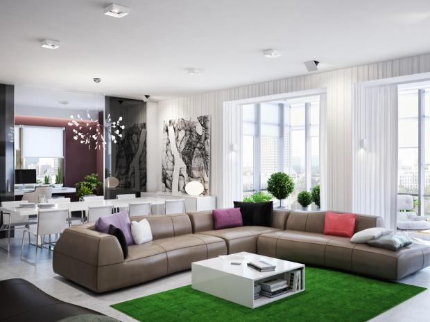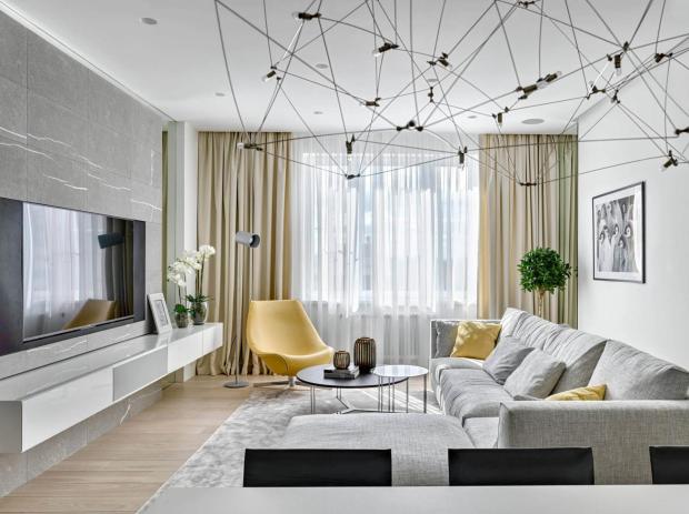 Гостиная в стильном белом интерьере квартиры с яркими акцентами получила приятный контраст с графитовым цветом и выразительные желто-зеленые вставки с подсветкой.