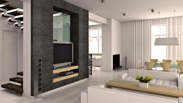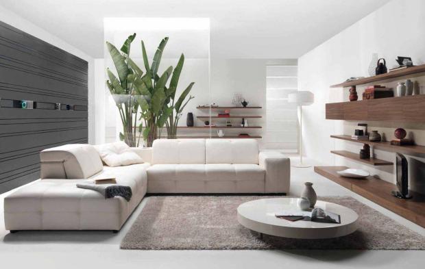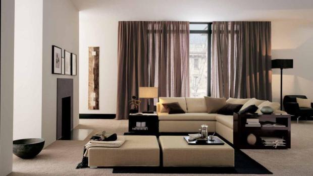 Дизайн интерьера гостиной в современном стиле подразумевает однотонную палитру (бежевую, белую, серую, коричневую), которая создает впечатление уютной, сдержанной обстановки. Уместен контраст светлого фона и темных плоскостей. |
