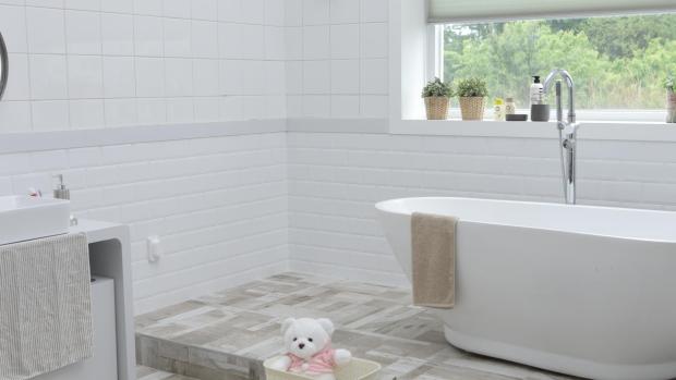 Стильный белый интерьер квартиры в Ялте смягчен отделкой ванной бежевыми и древесными оттенками, а еще живыми растениями на полках.