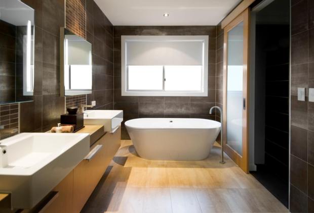 Оформление интерьера ванной комнаты в современном стиле выполняют в светлом или темном варианте. Цветовая доминанта – белый, серый, коричневый, черный. |