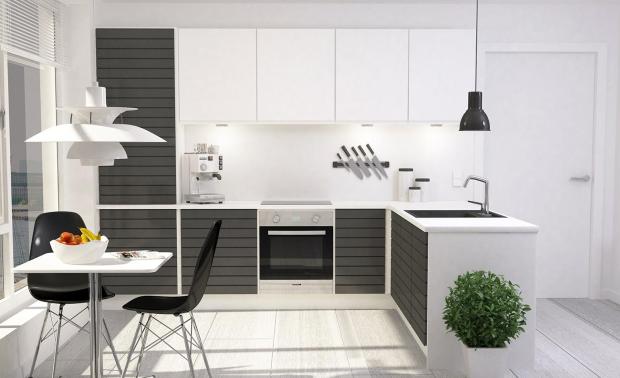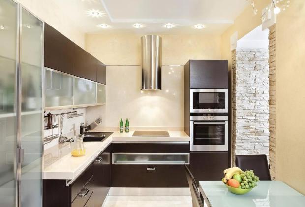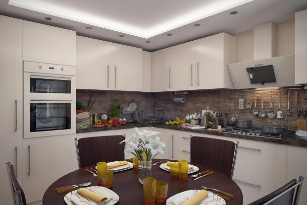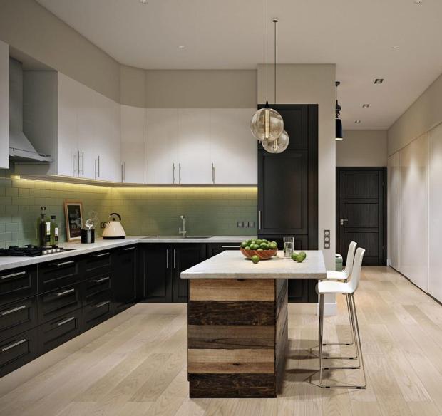 Для кухонной зоны в актуальном дизайне уместна как светлая гамма (белый, бежевый, серый, голубой и т.п.), так и темные тона (коричневый, графитовый). Часто главным приемом является контраст двух основных цветов с подключением яркого акцента в виде стульев, отделки стены, броского фартука, посуды, текстильных элементов. |