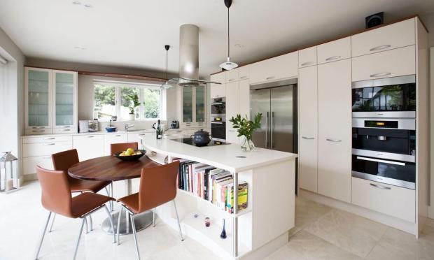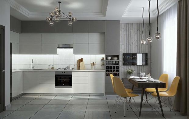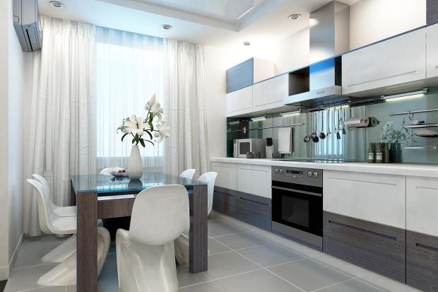 Для оформления кухни характерна внешняя лаконичность, рабочие зоны удобны и просторны, каждый квадратный сантиметр функционален. Обеденная зона тоже обустраивается максимально эргономично.