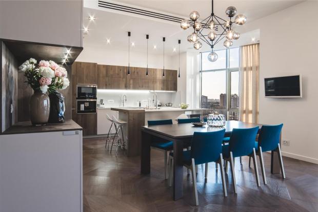 В проекте уютного интерьера квартиры с тремя комнатами гостиная и детские спальни выдержаны в традиционном стиле, а вот кухню решено оформить с модным глянцем, оригинальными стульями и мебельным гарнитуром без ручек.