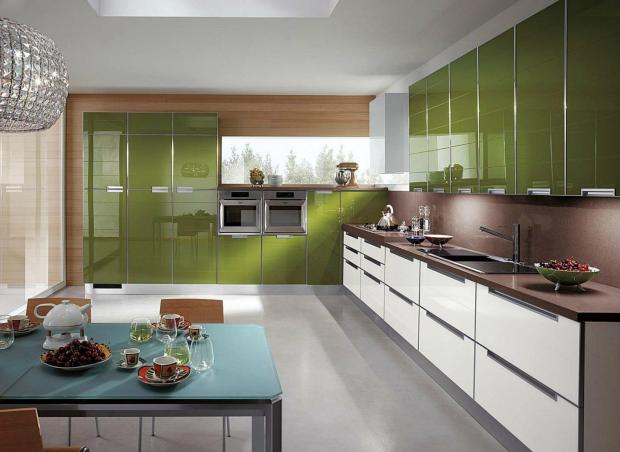 Доминируют глянцевые, стеклянные поверхности. Совершенно гладкие снаружи фасады (механизм открывания push-to-open) скрывают внутри вместительные системы хранения, выездные панели, выдвижные корзины, полки-карусели. |