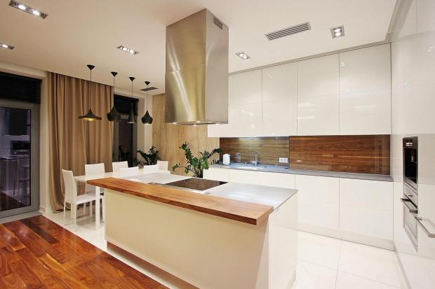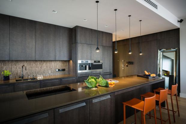 В просторной кухне организуют освещение нескольких видов: встроенные по периметру потолочные светильники (в рабочей зоне – обязательны) отвечают за общий свет, большая подвесная люстра располагается над обеденным столом, барная стойка выделена собственным светом (как правило, тремя-четырьмя подвесными лампами). Дизайн светильников – всегда оригинальный, нестандартный. |