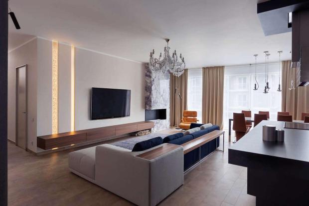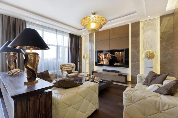 Скрытая подсветка выразительно оформляет потолочные уровни, регулируемые софиты направляют внимание на нужные зоны. Подвесные лампы и напольные торшеры берут на себя задачу декорирования и зонирования. |