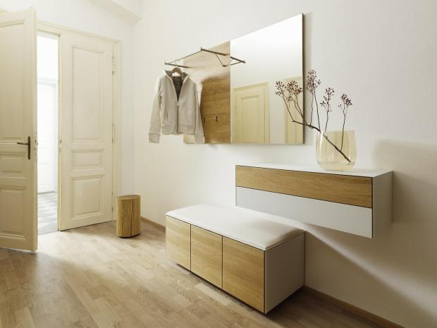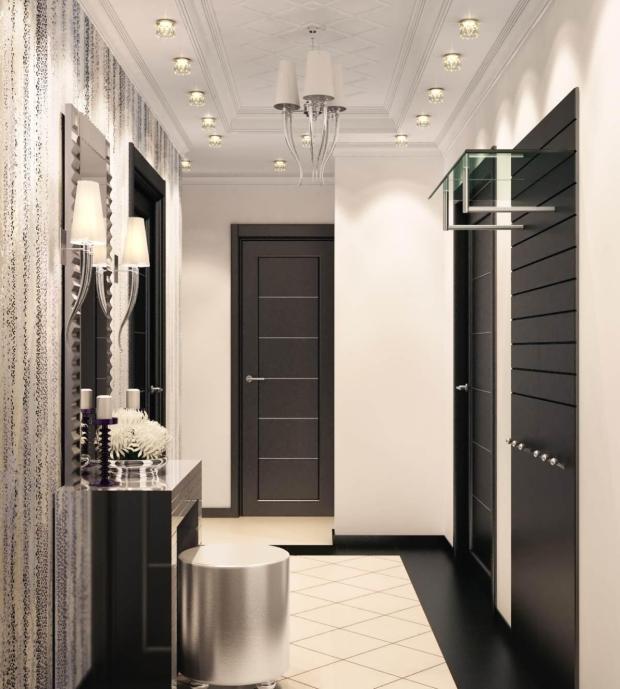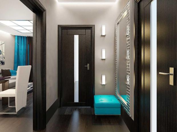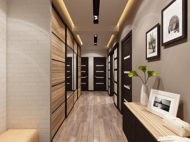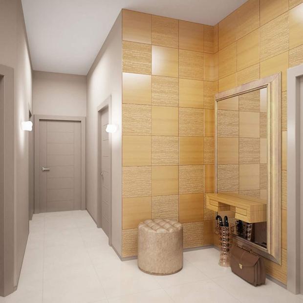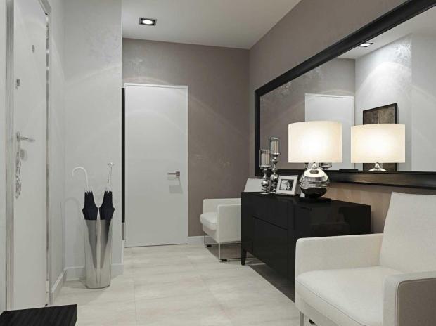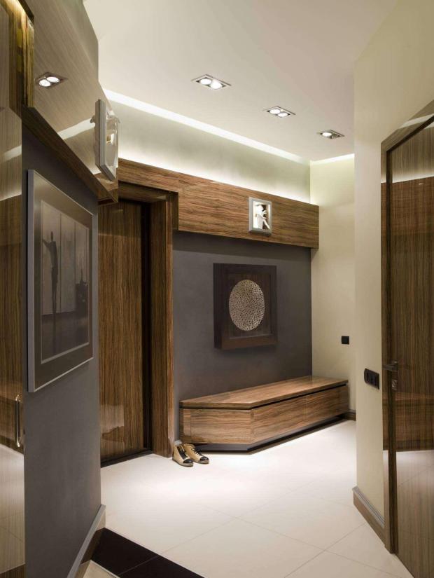 Аккуратность, смысловая и цветовая ясность интерьера прихожей с первых минут создает приятное впечатление о квартире в целом. Отделка, меблировка, оформление дверей в сочетании с теплой подсветкой легко воспринимаются единой композицией.